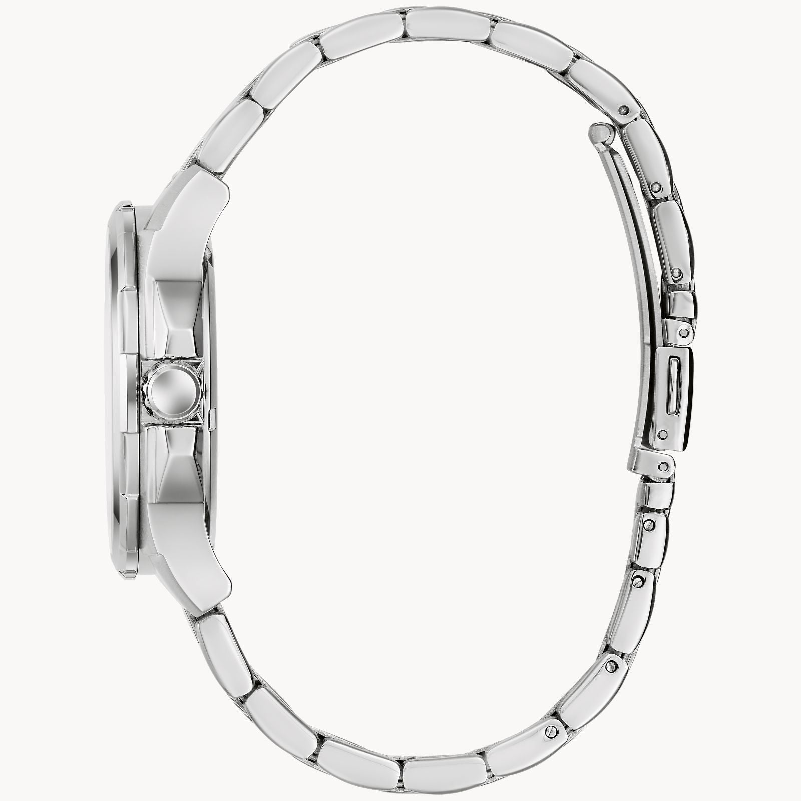 A stylish, contemporary Caravelle men’s timepiece. The silver-tone stainless steel case features a modern, angular silhouette with crown guards and a flat mineral crystal. The silver-white textured dial is accented with a gray-tone minute ring, applied luminous hour markers, and a matching polished handset with luminous fill. Flanked by a small seconds display and a 24-hour display, the 21-jewel automatic movement is visible through an aperture and offers a robust 42-hour power reserve to keep you on time, day and night. The exceptional mechanical movement can be fully admired thanks to a see-through case back and the watch is completed with a matching multi-link bracelet with a fold-over clasp. A fusion of modern mechanics and modern design from Caravelle.