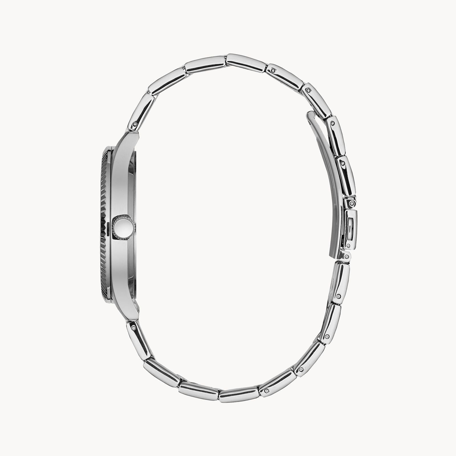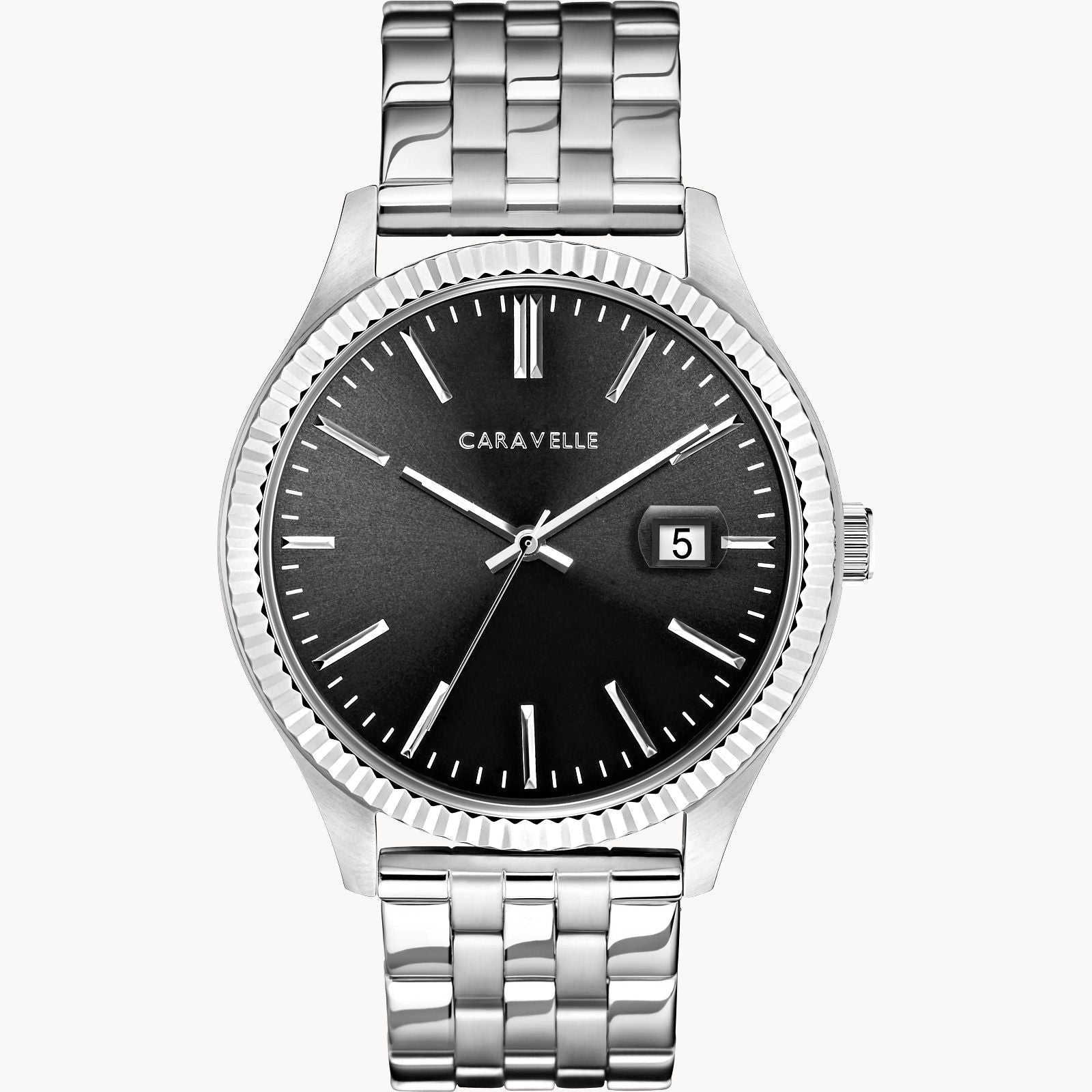 Sleek and streamlined stainless steel with serrated-edge bezel, gray dial, luminous hands, date feature, second hand, and fold-over buckle closure.
