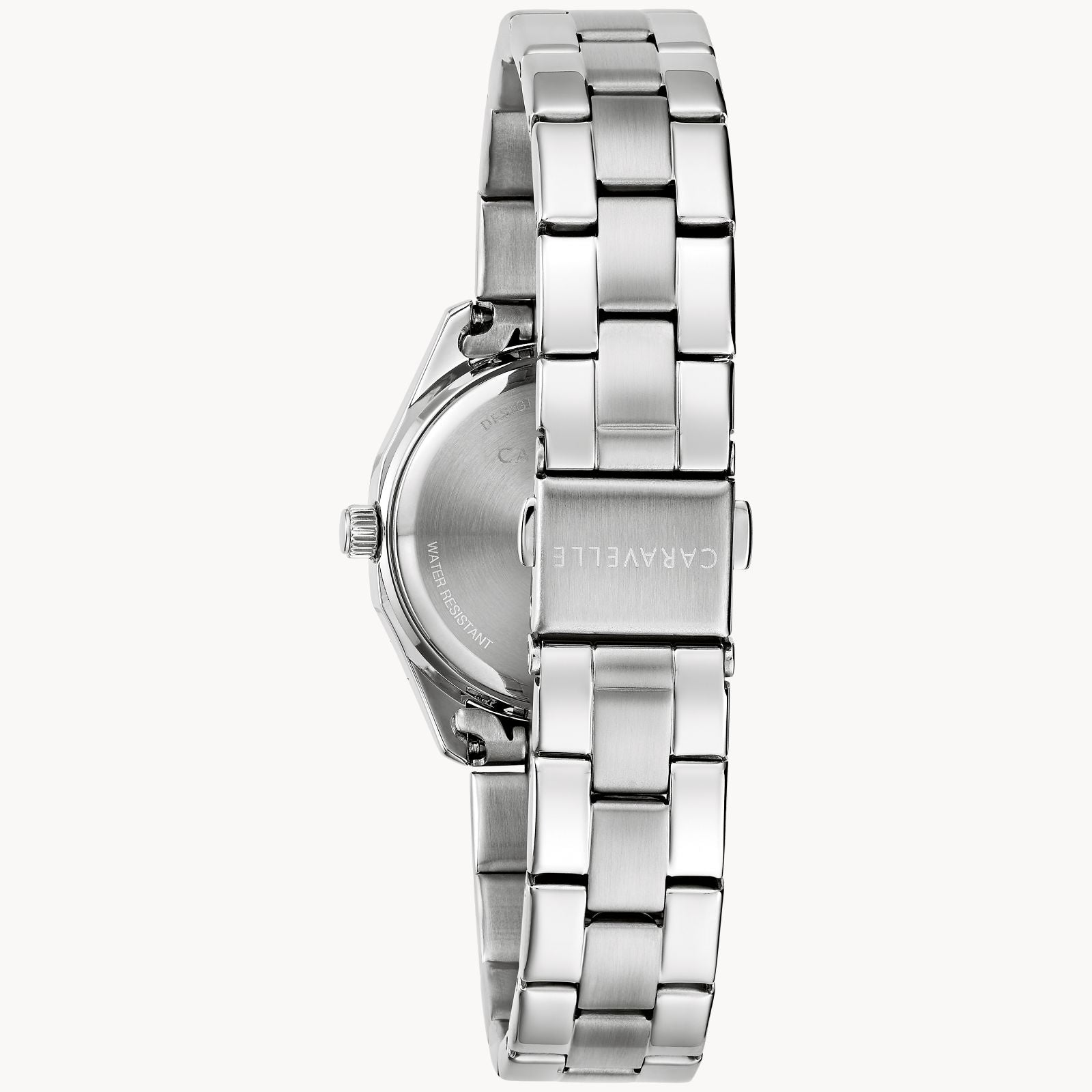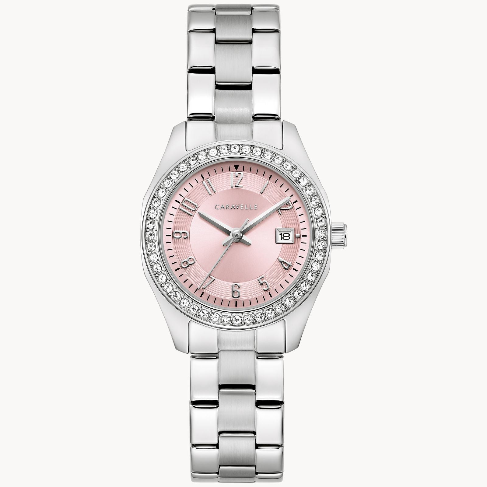 This Caravelle women’s timepiece offers all-day dazzle and petite perfection. The sporty design features a silver-tone stainless steel case with a sparkling bezel set with 48 brilliant crystals. The pink dial features contrasting finishes for a dynamic appearance, with polished Arabic numeral markers, a matching handset, and a framed date display. The watch is ideally paired with a dual-finish silver-tone stainless steel bracelet with a push-button fold-over closure for a slim silhouette. A fabulous expression of style from Caravalle.