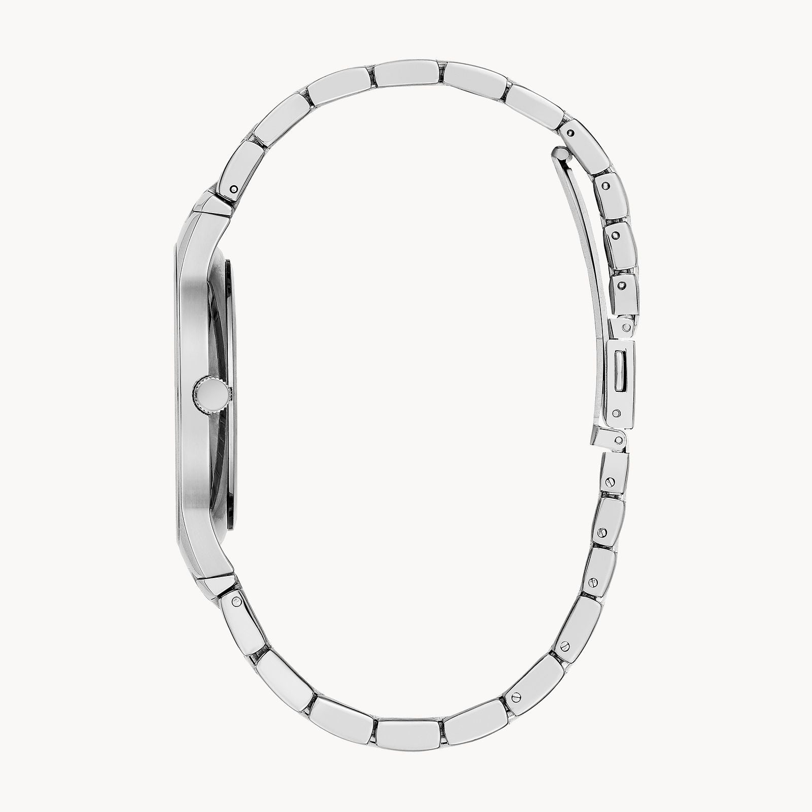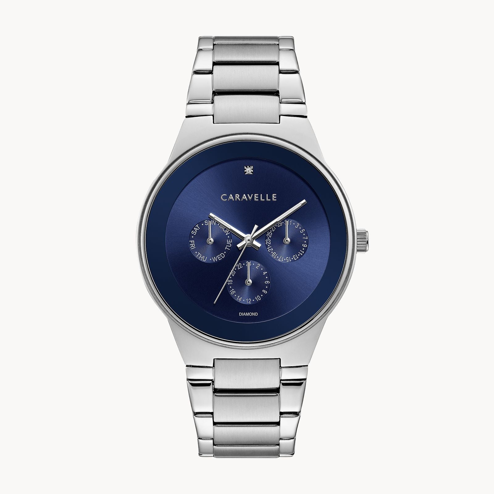 The modern way to multitask. A single diamond at 12 o'clock accents a midnight blue dial with luminous hands and multifunction movement with day, date and 24-hour sub dials, and edge-to-edge metalized crystal. Stainless steel case and bracelet with double-push fold-over closure. The case measures 40 mm, and the watch is water-resistant to 30 meters.