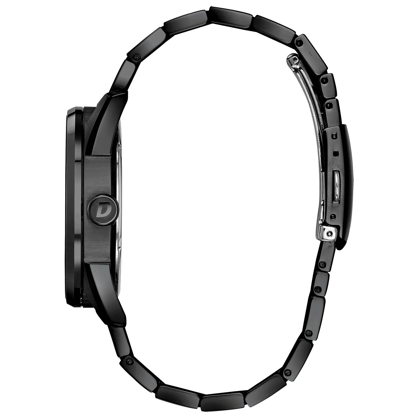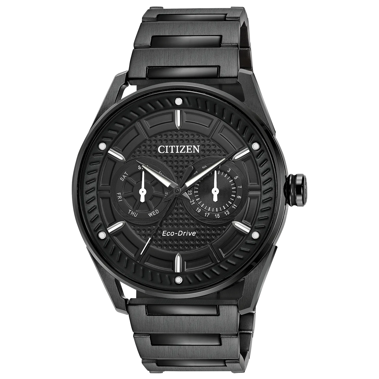 The Drive from Citizen collection. A collection of watches with simple classically modern design, all powered by Eco-Drive Technology. Watches powered by any light and never need a battery change. Featured here in black ion-plated stainless steel with a bold black dial, day and date. Featuring our Eco-Drive technology – powered by light, any light. Never needs a battery. Caliber number 8725.